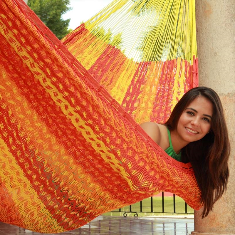 Hamaca tejida con grueso hilo de 100% nylon. Es una hamaca verdaderamente grande, que pesa 3 kilos. La hamaca puede ser empleada para el uso constante en los hoteles, centros de vacaciones, restaurantes, sitios de juego o en general en espacios públicos.