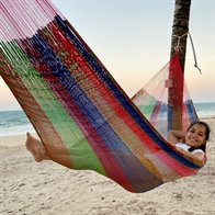 Espacio para 2 personas. No ocupa mucho espacio, siendo adecuada para llevar a paseos. Relájese y disfrute del sol. Hecho de 80% de algodón y 20% de nylon. La cama de la hamaca, es decir el lugar donde uno se acuesta, está hecha de algodón, mientras que el extremo de los hilos son hechos de nylon. La combinación perfecta. El algodón siempre es más blando que el nylon. Es una hamaca que se adapta al cuerpo de la persona que se acuesta en ella. Y usted se puede acostar a lo largo o diagonalmente. Los niños pueden acostarse de forma transversal.