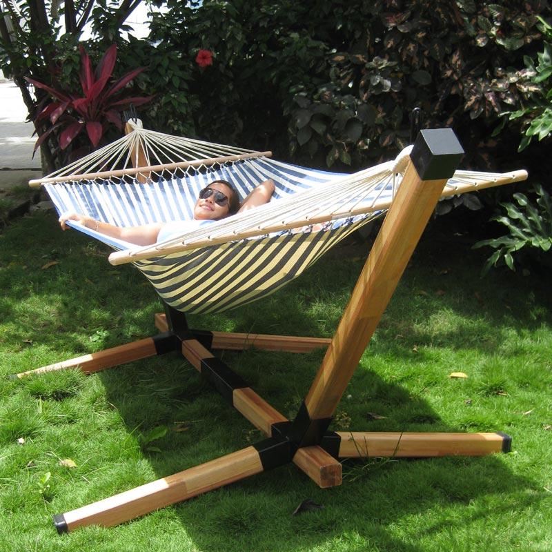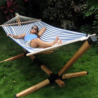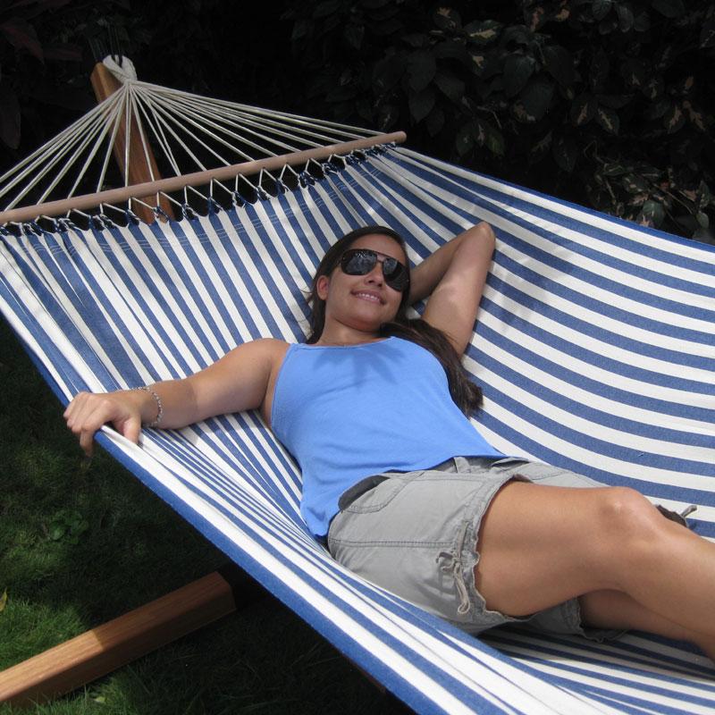 Hamaca rayada azul y blanco con soporte en madera de Eucalipto.